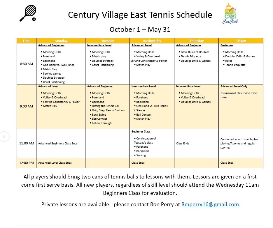 CVE has several tennis courts at the Clubhouse and throughout the Village. Click the button below to learn more about the CVE Tennis Club.